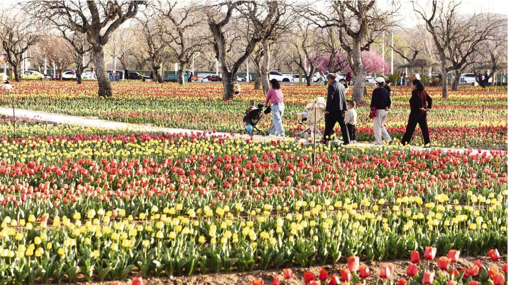 永靖县黄河花堤郁金香盛开、吸引众多游客前来赏花观光