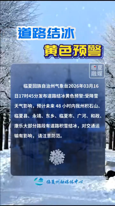 道路结冰黄色预警!临夏州气象台发布预警,未来两天出行请注意防滑