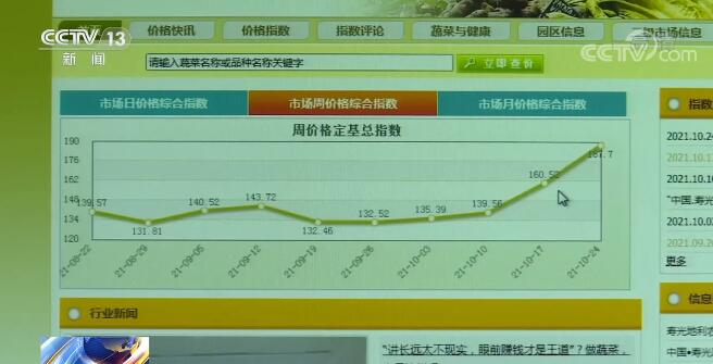 这是商务部监测的最新一期36个大中城市蔬菜批发价格走势图,从图上我们可以看到,从今年9月下旬开始,这一指数就开始呈现出上扬态势,已经连续四周上涨。