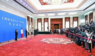 3月12日,十四届全国人大一次会议举行第三场“代表通道”采访活动。新华社发