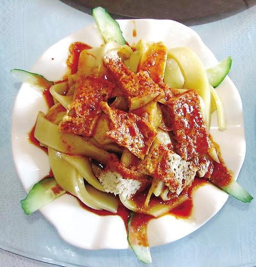 有人爱吃甜,还有人想吃辣。懂营销的小吃店家很精明,他们同时卖广河甜麦子和河州酿皮,那样食客就不用两处跑了。只见圆盘里一张张黄灿灿的酿皮,油光水滑,看着就让人流口水,当把酿皮子切得宽窄均匀,盛在盘子里,上面盖上几块面筋,拌上红红的油泼辣子、白的芥末汁、黄的蒜泥,再加上盐、醋,呈在眼前,使人顿生谗涎,配上芥末和蒜,一股清冽冽的香气,瞬间让人食欲大增。