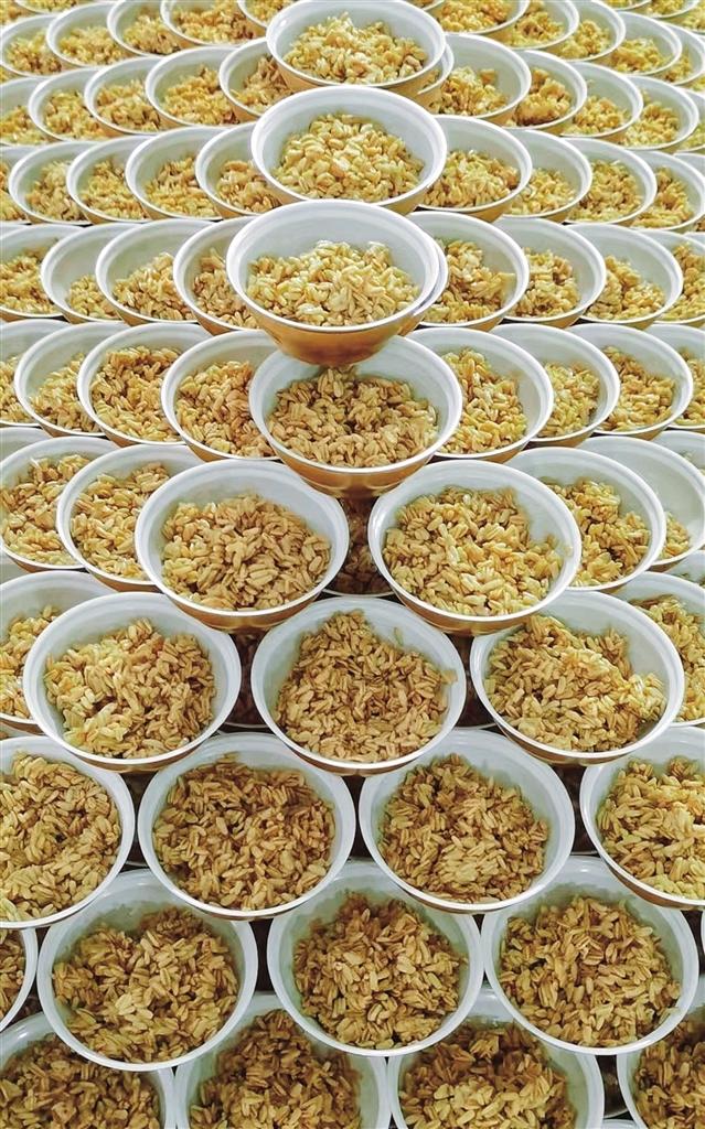 在谷堆一样的甜麦子面前,谁能迈开腿?移开目光?甜麦子是一种清凉解暑的甜品,用青稞或莜麦作主料,经过发酵制作而成,口感酸甜,备受男女老少青睐。有顾客打包,老板就将小碗用清水冲一下,然后将甜麦子快速舀到碗里,再装进食品盒或袋子,那只小碗就是计量工具。也有客人直接在摊位上品尝,摊主很贴心,舀好甜麦子后,还会询问是否要加水,水当然是提前烧开晾凉的,很多人更喜欢加水的甜麦子,没有吃过的游客会先尝一点,再决定要不要加水。