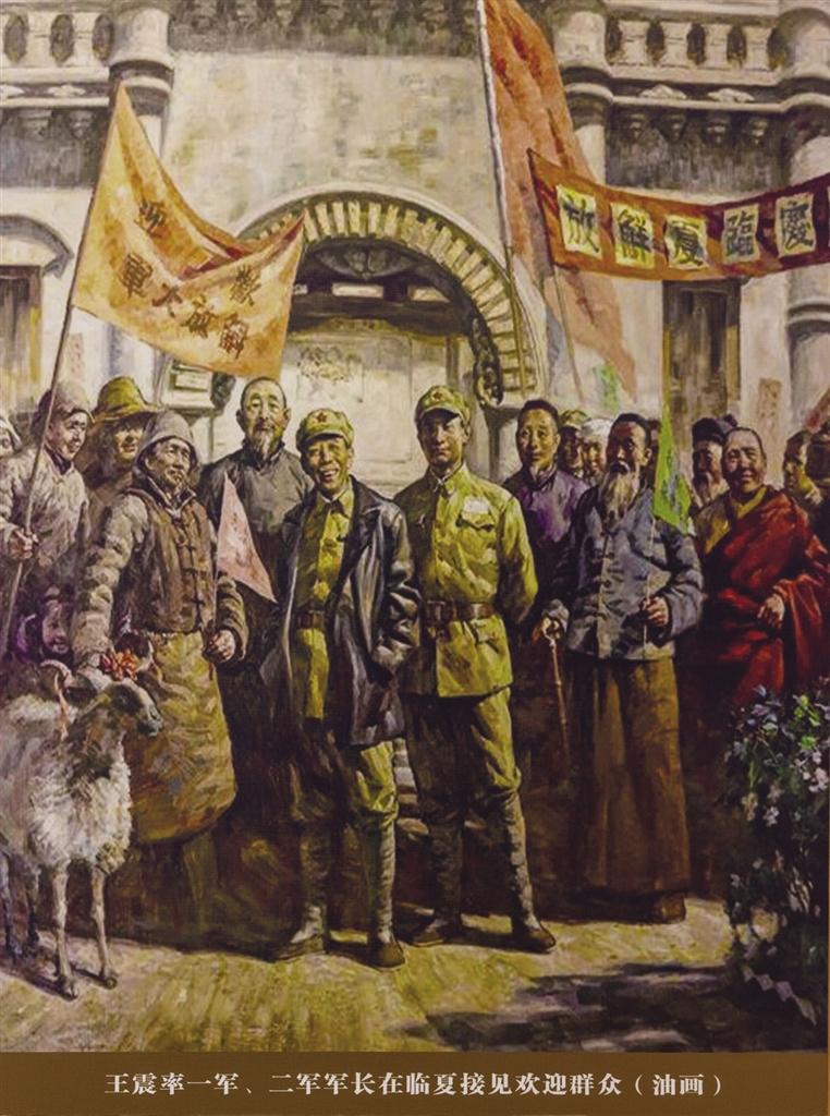 王震率一军、二军军长在临夏接见欢迎群众(油画)