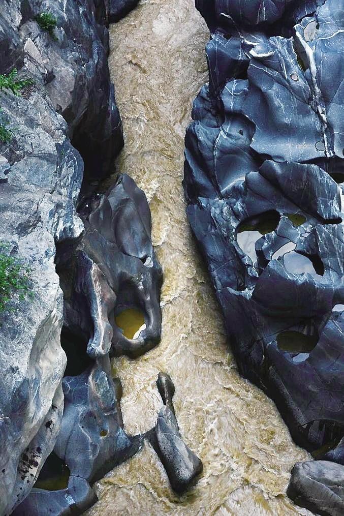 在洩湖峡中,与数量众多冰臼一起的还有各种奇形怪状的奇石,峡谷两壁和河床中的岩石,石质坚硬,以黑色为主,并在石面上夹杂有白、黄等色纹理,色泽丰富,表面光滑,具有良好的观赏性。另外还有米黄、浅黄色的石块也散布其间。在阳光照耀下正是在漫长的冰川运动和滑动,与寒冻、雪蚀、雪崩、流水等各种应力的共同作用,形成了洩湖峡独有的冰川地貌景观