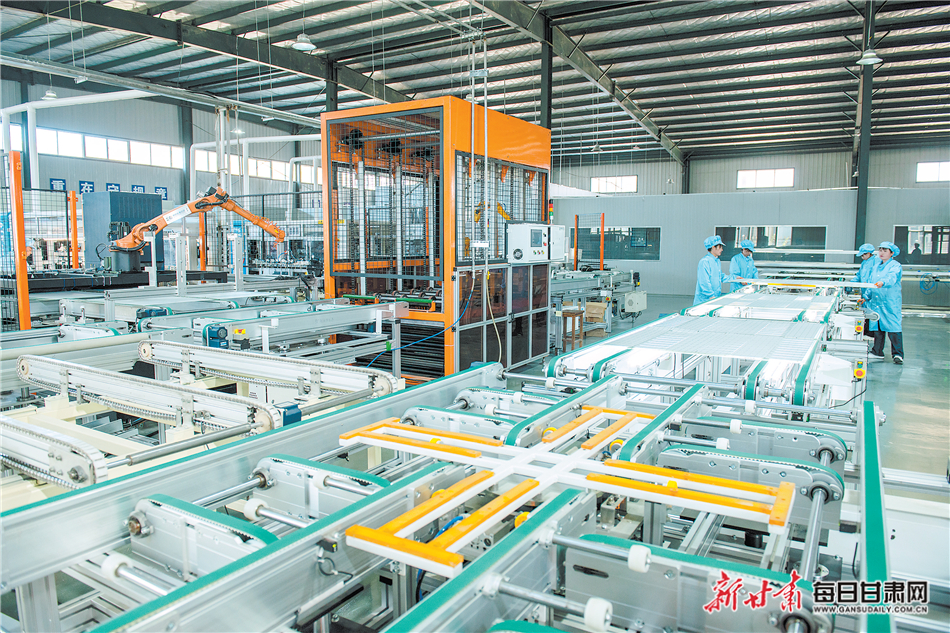 定西创盛光能源有限公司通渭县200兆瓦高效太阳能光伏组件生产车间内,工人们加紧生产。新甘肃·甘肃日报通讯员 张子斌
