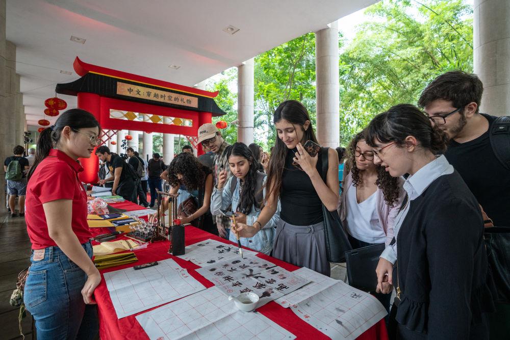 △2025年4月,在巴西里约热内卢天主教大学举办的“国际中文日”庆祝活动上,学生们体验中文书法。