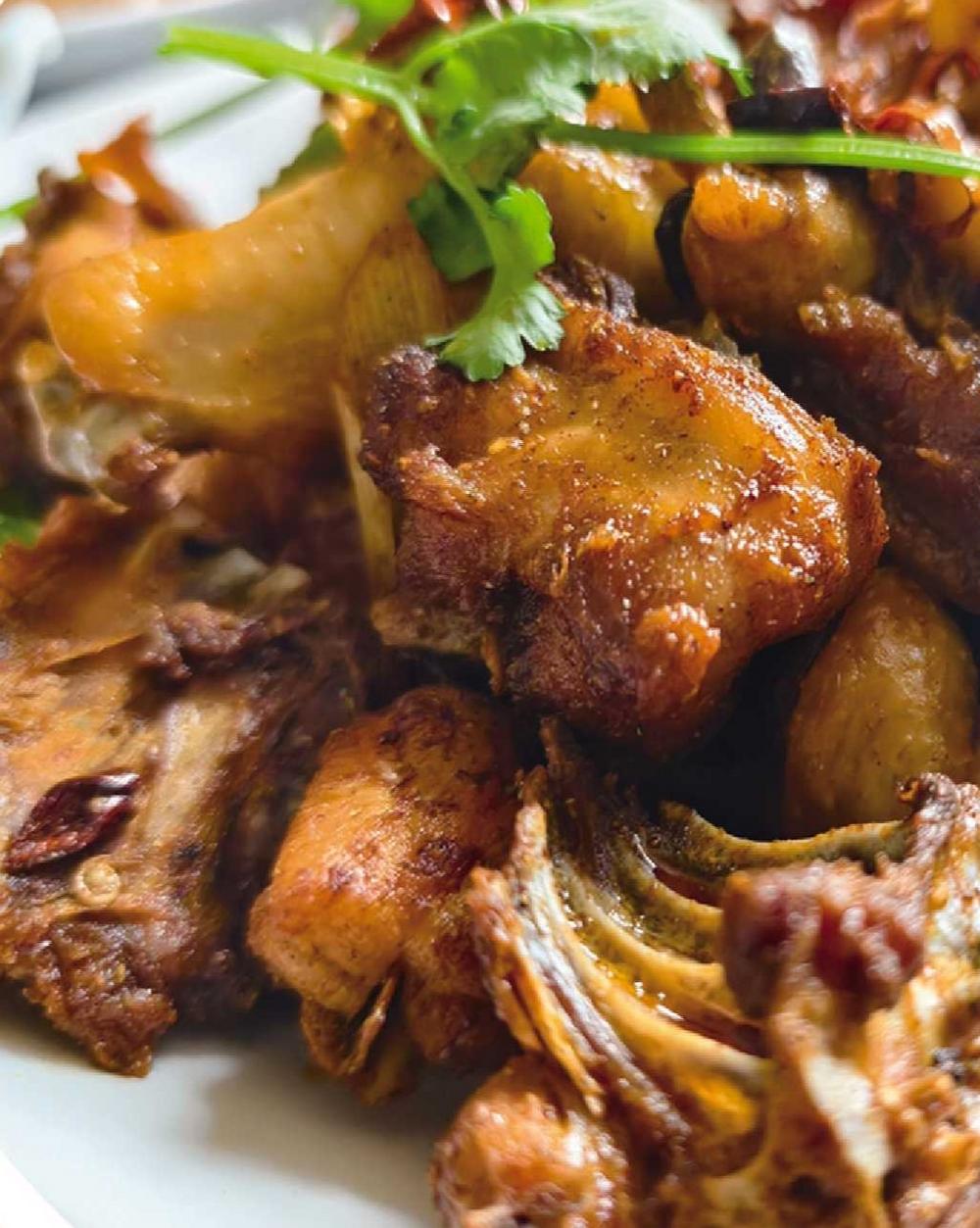 赛义德农家乐掌勺者是位女子,高挑、秀丽,翻炒草鸡麻利,颠锅手腕有力。她不停翻炒,直到每块鸡肉都裹上油光,带上焦香,嗞嗞冒出香气,再添加调料继续翻炒。