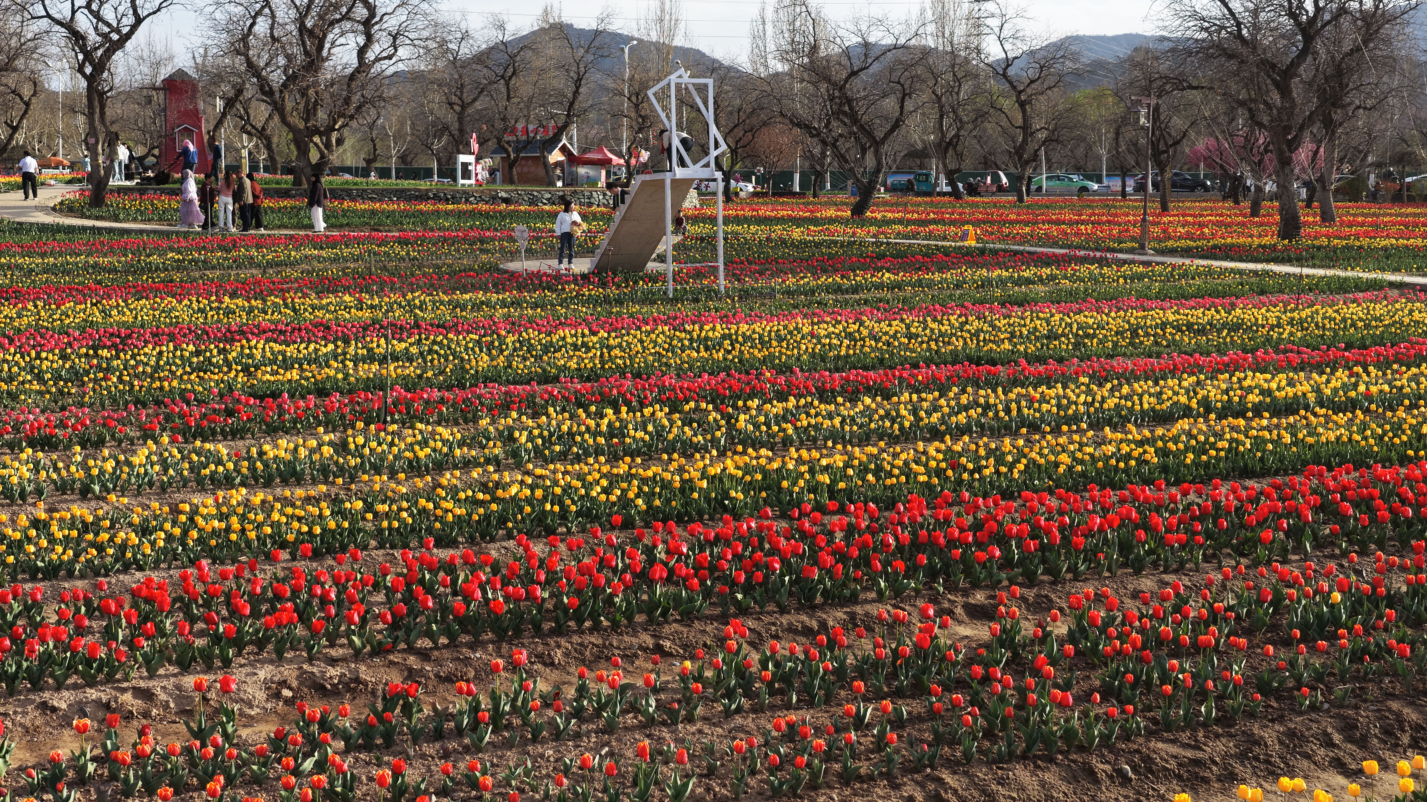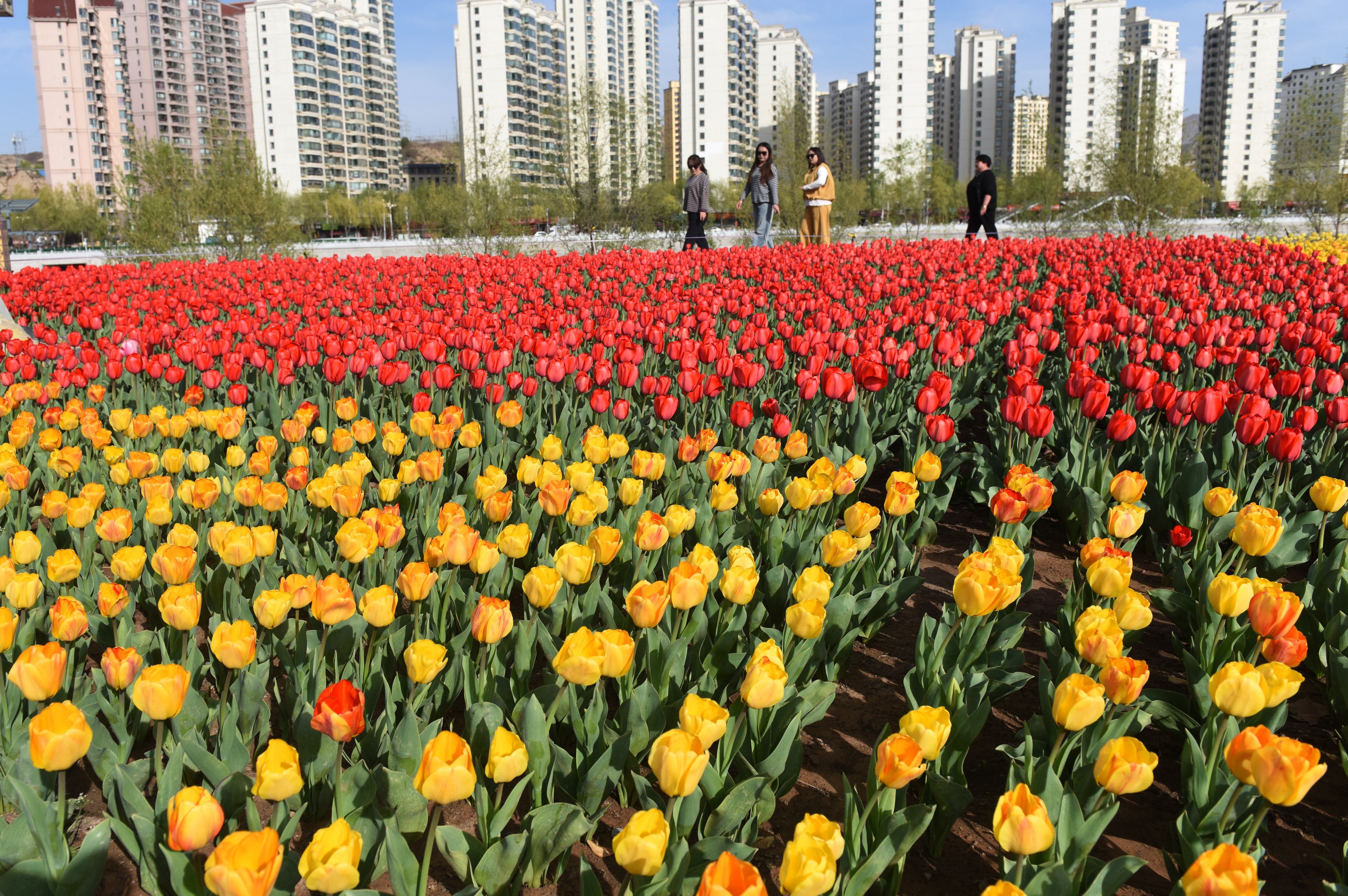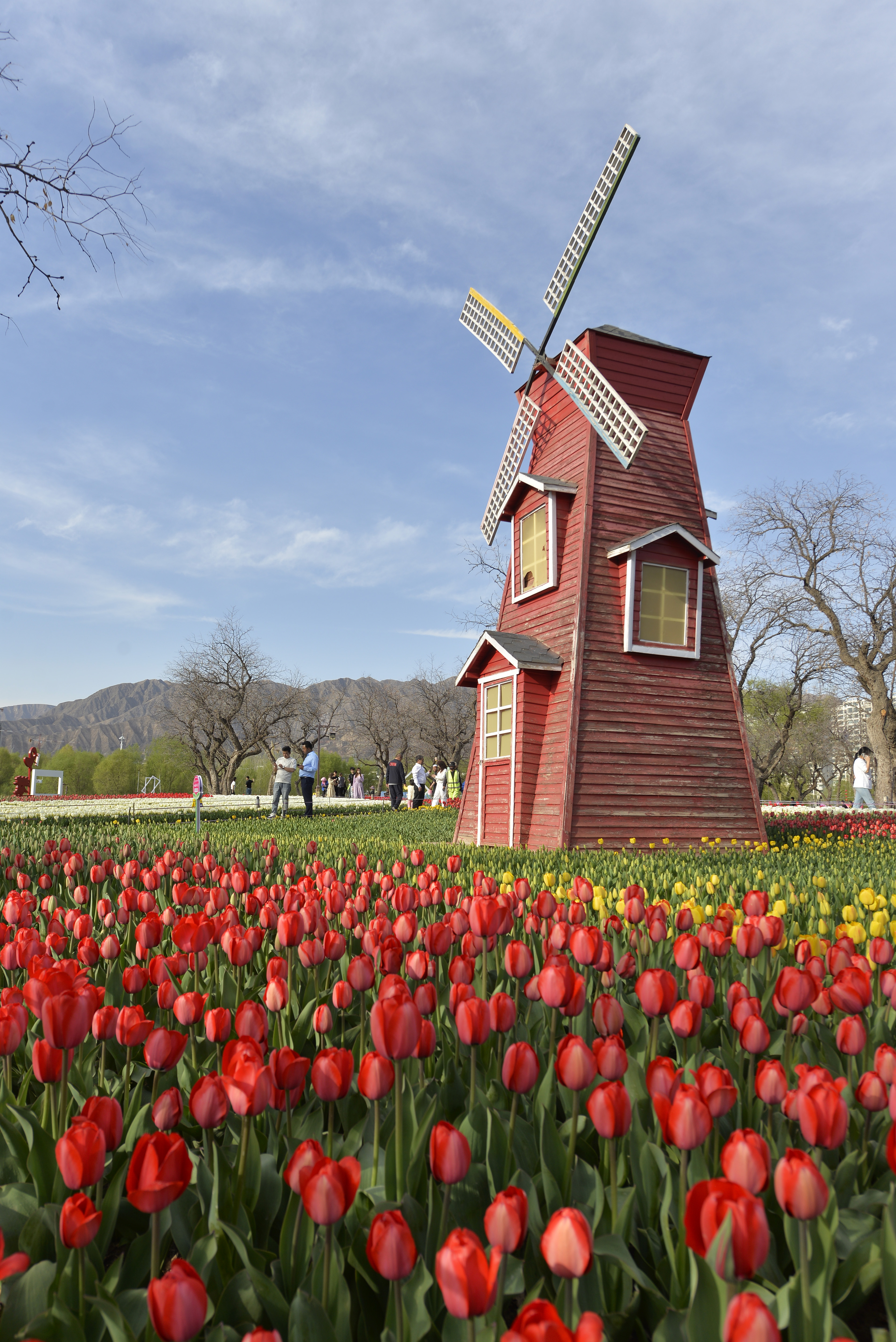 4月9日,游客在永靖县刘家峡镇欣赏郁金香