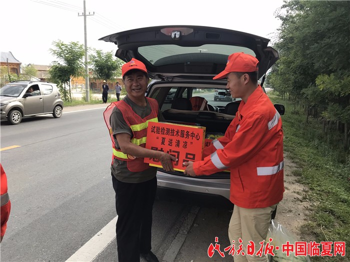 7月27日,为大力推进高温季节的安全生产和劳动保护工作,给广大职工营造一个安全、舒适的工作环境,临夏公路管理局试验检测技术服务中心以“送清凉”为主题,坚持以人为本,牢固树立“安全第一、预防为主”的思想,加强防暑降温,保障广大职工的身体健康,中心工会组织充分认识到夏季高温对广大一线作业职工的健康危害,中心工会主席为在路上工作的职工送去解暑物品,并向不畏酷暑、辛勤工作在一线的职工致以诚挚的慰问,让职工感受到了炎炎酷暑里的丝丝清凉,切实保障职工身体健康。 (马文兰)