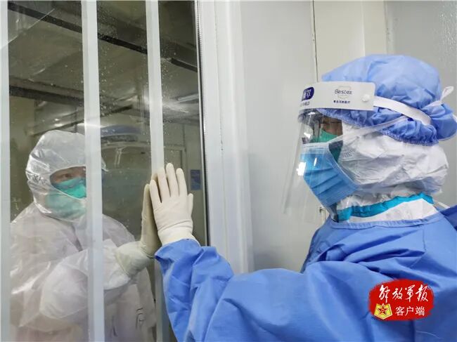 身体突发不适,同事(左)从“黄区”伸手与陈敏(右)隔窗鼓劲。