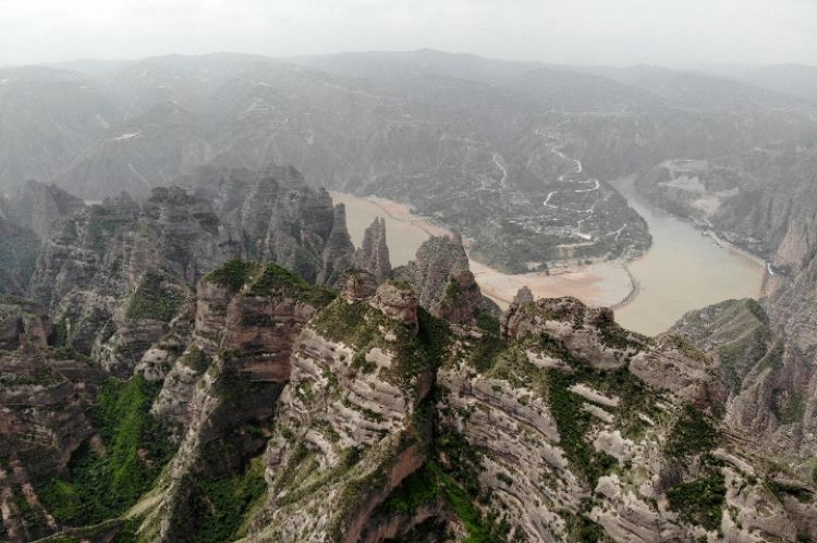 这是在甘肃炳灵丹霞国家地质公园拍摄的炳灵石林(5月19日无人机拍摄)。