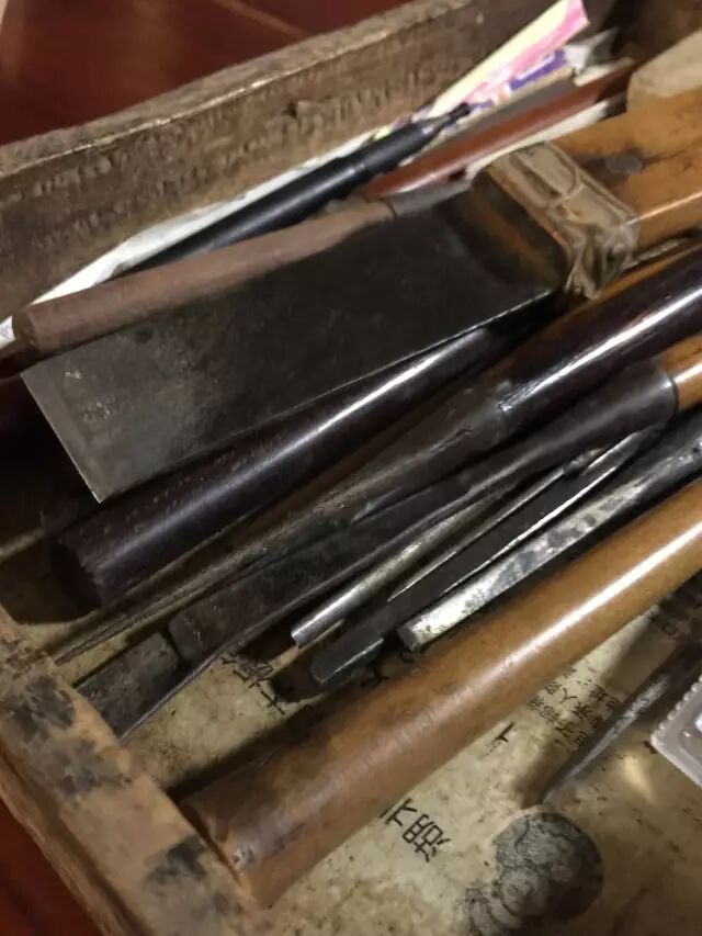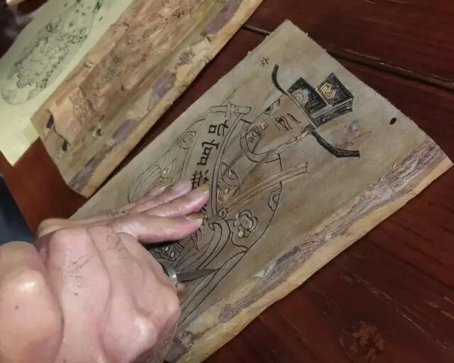 刻线版就是将画稿贴在刨平的木版上,用多种刻刀刻出线版。在刻版的时候,为了达到精致精细的效果,手艺人要用上大大小小十几种工具。