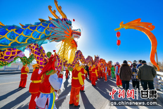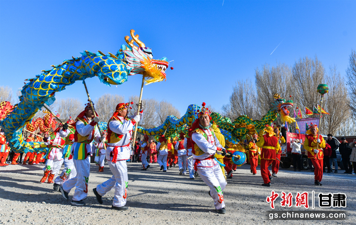 2024年2月14日,甘肃省敦煌市社火队正在白马塔景区进行社火——舞龙表演。