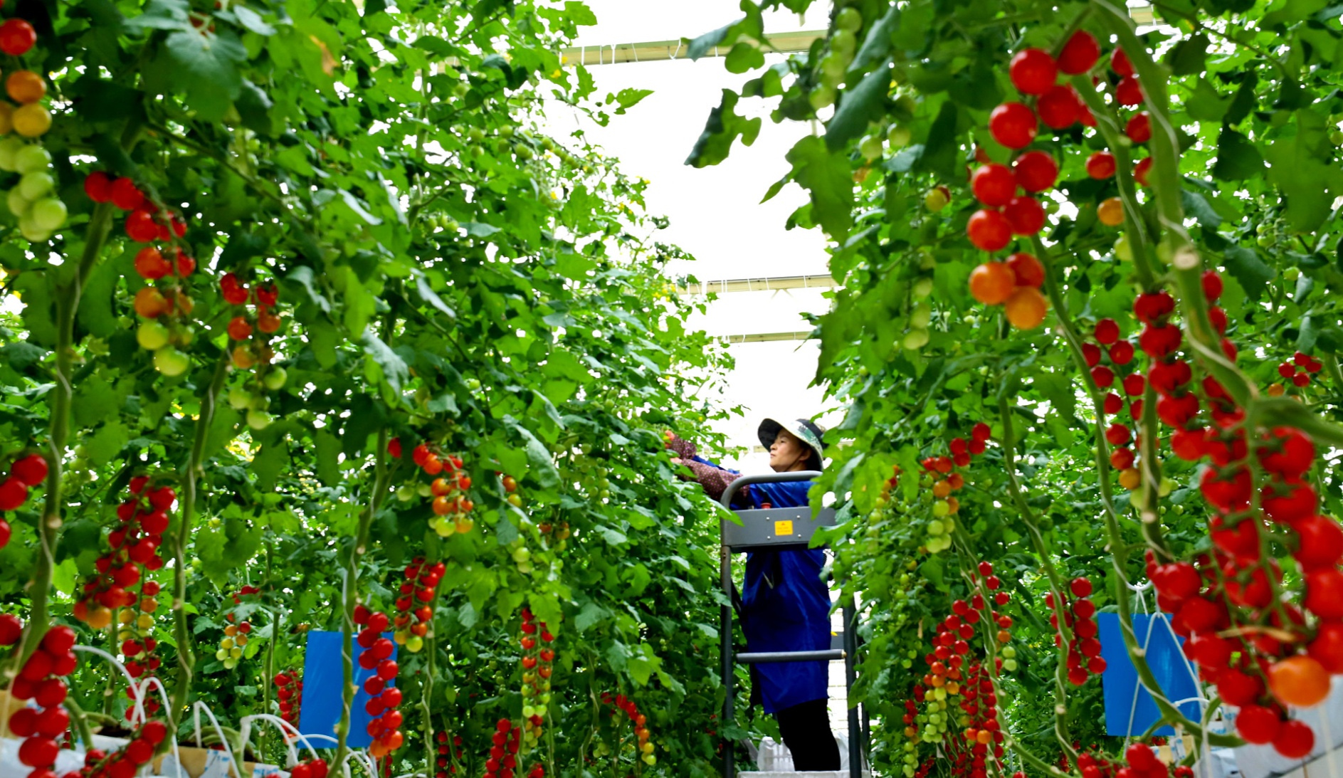 甘肃张掖:工人智慧农业工厂温室内采摘首茬樱桃番茄