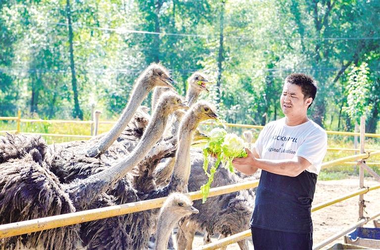 康乐县苏集镇马寨村吊湾社的长信家庭农场现存栏成年鸵鸟30只、幼鸟66只,鸵鸟养殖成为当地群众新的增收渠道。图为长信家庭农场负责人牛亚利正在给鸵鸟喂草。
