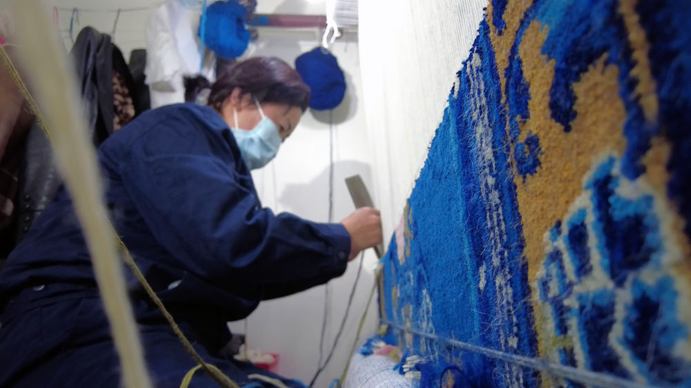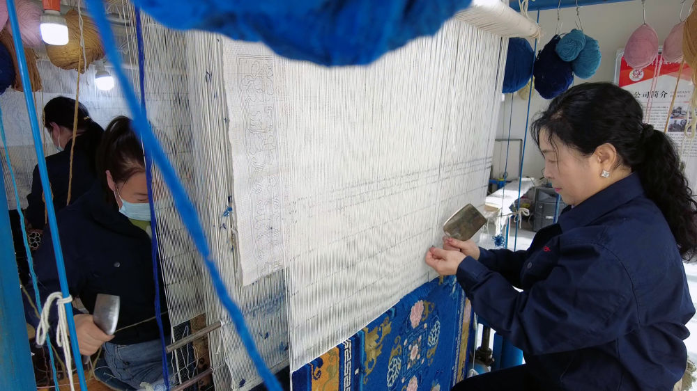 春分时节,春意盎然。在甘肃省武威市古浪县陇原巧手传统手工制品有限公司的生产车间里,40多位女工正在聚精会神地制作地毯。她们将不同颜色的毛线依次拴在一股股竖直的经线上。伴着“嗦嗦”的编织声,跃动着蝴蝶、牡丹等图案的地毯隐约可见。
