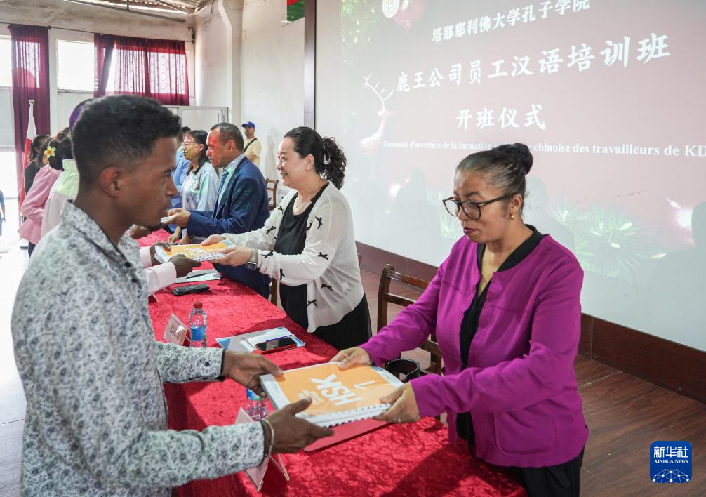 这张内蒙古鹿王羊绒有限公司马达加斯加工厂提供的照片显示,在马达加斯加塔那那利佛孔子学院,内蒙古鹿王羊绒有限公司马达加斯加工厂的员工参加汉语培训班开班仪式。新华社发(内蒙古鹿王羊绒有限公司马达加斯加工厂供图)