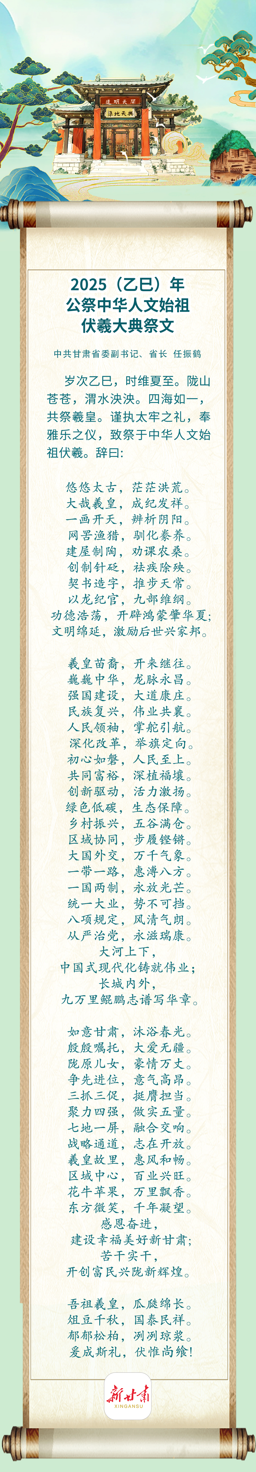 “陇山苍苍,渭水泱泱。四海如一,共祭羲皇。谨执太牢之礼,奉雅乐之仪,致祭于中华人文始祖伏羲。”祭文追思太昊伏羲“一画开天,启文明之曙光”功德,歌颂中华民族只争朝夕、攻坚克难取得的伟大成就,讲述陇原儿女牢记领袖嘱托,全面建设社会主义现代化幸福美好新甘肃的奋进故事。