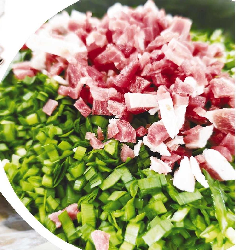 制作格目,是临夏人家代代相传的手艺,每一步都藏着讲究。韭菜性温、味辛,有补益温阳和益肝健胃的作用,素来喜食重口的临夏人对其情有独钟,从包子到格目,用面皮能包住韭菜的汁水与辛香。食材选择上,首重时令与本味:韭菜与韭苔鲜嫩水灵,韭苔掐头去尾只取中段,脆嫩中带着清甜,韭菜要选新鲜的;羊肉要选肥瘦相间的,剁成指尖大小的丁,油脂丰腴却不腻口;面团和制讲求分寸,面粉选用当地产的冬小麦粉,开水和面,揉出的面团既筋道又不易破,揉至软硬适中后,搓成长条、揪成剂子,擀成椭圆薄皮,皮要薄而不破、边缘略厚,才能兜住满满的馅料。