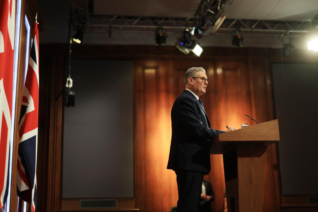 4月1日,英国首相斯塔默参加在伦敦举行的新闻发布会。新华社发(英国首相府供图)